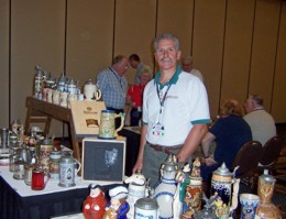 We were able to get grants from the City of Louisville, Louisville Convention Bureau, as well as our "Travel Partners," Pilot Oil Corp., and Cracker Barrel Old Time Country Stores. We were able to get tax exempt status in Kentucky based on our application and SCI 501c 3 Federal Status. This action saved thousands of dollars that would otherwise have been paid by the members attending. Registration Credit cards were used again for pre-registration, however, a fee was charged to offset their cost. The Convention Bureau provided lanyard badges and holders for all. Our registration packets contained discounts to several restaurants and bars within a two block radius of the hotel as incentives for our convention attendees. Each of the five states represented in our chapter made gift baskets designed to show the diversity and cooperation of all our members. Pre Convention Activities The Convention Connection Travel Service provided all our tours with a TSV member on each tour to handle any concerns and information that were needed. The most popular was "Breakfast at Churchill Downs" with the trip to "Woodford Reserve Distillery" a close second. The visit to Louisville Stoneware surprised all of us with its popularity. Convention Activities German night was held at the German American Club of Louisville where authentic German food was served along with German beer by the pitcher. German music by Gerbhart Ehrler was an additional treat. Drema Harden was named Miss Beer Stein for 2007. Traditional High Tea was done by the hotel staff with Rita Hackmiller overseeing. There were 42 people in attendance. The Great Gatsby Night Dance with the Dave Jones orchestra was a great success with many in costumes of the period when the Seelbach was in its prime. Many "flappers" competed for prizes. Convention Auction We saw the first auction by the newly formed Stein Auction Co. with Gary and Andre together. The highlight was the spirited bidding for a Mother of Pearl Tankard that reached a total cost of $120,850. I believe this is a record for a sale at any SCI convention.