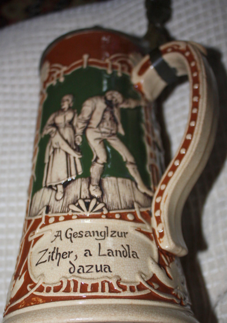 This verse in Bayrisch (Bavarian dialect) means that the right music, like a Schuhplattler (Bavarian country dance) gets things going and they're not easy to stop. The stein is marked "309 Germany", ca. 1900. | |