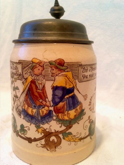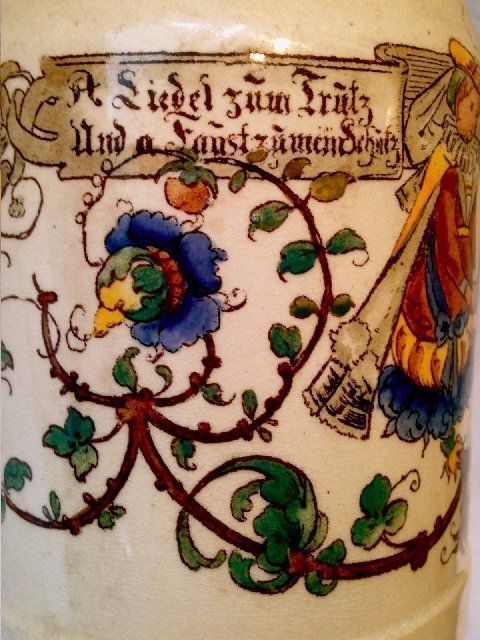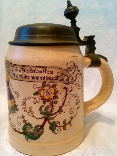 This is a cute 0.5L PUG (printed under glaze) VBM stein mold #1526 decor #591 dated 1901. The Bayrisch (Bavarian dialect) verse seems to fit the scene and is self explanatory. | |