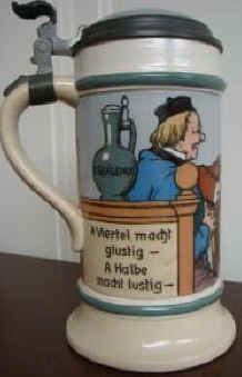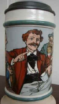 I'm not sure that the conversation becomes sensible after a liter of beer, but maybe if everyone else has also had a liter of beer. This etched, Jugendstil (youth style = modern art) stein was designed by Fritz Quidenus and marked with the Mettlach logo, form number 3219 and dated 1908. | |