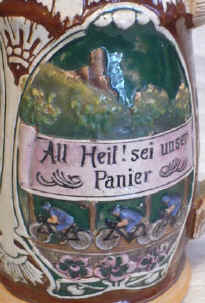 "All Heil" was the greeting of German cyclists on the road featured on this relief cyclist's stein probably by Girnscheid ca. 1900. I'm sure this greeting of cyclists is still the same now. | |