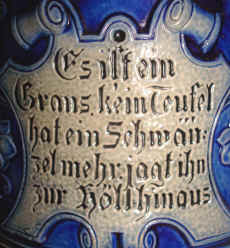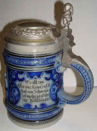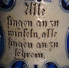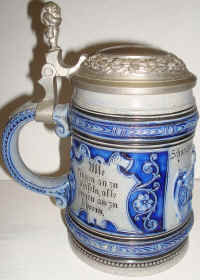 | This is a very interesting blue/gray, stoneware stein marked with the logo of Reinhold Merkelbach and form number 362, ca. 1900. The story of the "Schneiders - Höllenfahrt" (The Tailor's Trip to Hell) has being published by Master Steinologist George Schamberger in Prosit, December 2013. It is a folk tale about a devil taking a Tailor to hell to make clothes for all of the demons there, but the Tailor causes so much trouble including cutting off their tails that they're finally forced to send him back out. This story could have been much more horrifying when it is realized that the German word "Schwanz" meaning "tail" also means "penis" in the common vernacular. There are many poems and songs written about this lore. One version was written by Heinrich Hoffmann in the mid 1800's and has 30 verses. | |