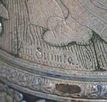 This is what the Bavarians do on Sunday and probably every other day too. The saying is in Bayrisch (Bavarian dialect) on this blue/gray, stoneware pouring stein without lid, ca. 1900. | |