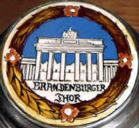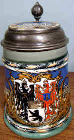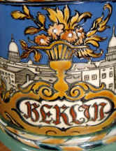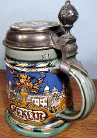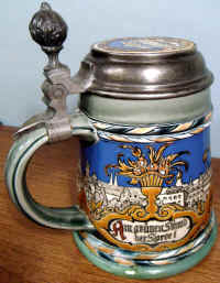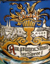 This is usually called the Berlin Stein and is an etched Mettlach mold number 2024, ca. 1900. The verse is from an old German song that was made into a German TV series in 1960. The scenes are from Berlin and the lid features the famous Brandenburg Gate. | |