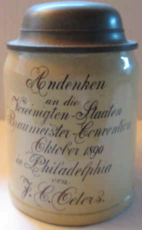 | The inscription on this stein is self explanatory and the stein is of the period, ca. 1890. The name "John C. Oeters" can be searched and was a brewer or malter in the Philadelphia area at the time. | |