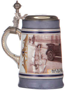 | This verse applies both to the man acquiring the car and the car enticing the young lady to get in for a ride. This rare, porcelain stein is hand painted and the lid is dated Sept. 3, 1926. | |