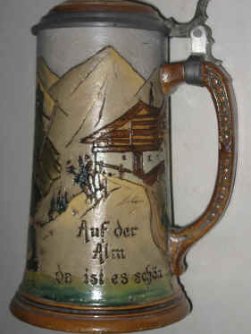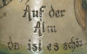 | The Alm is the mountain pasture where the farm animals are taken to graze in the summer by groups of farmers. It is a time of festivity. This is an etched stein by Reinhold Hanke ca. 1900 with the logo and mold number 1388 9 and artist signature "GK". | |