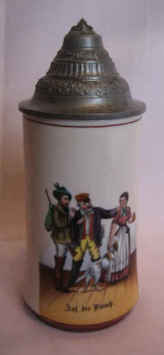 A nice porcelain stein entitled "On the hunt", but it's not obvious what's being hunted. The stein has a lithophane (scene visible when held to the light) in the base and ca. 1900. | |