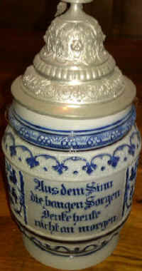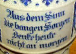 This is a self explanatory verse on a blue/gray, salt-glazed, stoneware stein, ca. 1900. | |