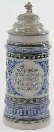 | Sounds like a good tavern slogan on this blue/gray, salt-glazed, stoneware stein marked with the Reinhold-Merkelbach logo and mold number 692, ca. 1900. | |