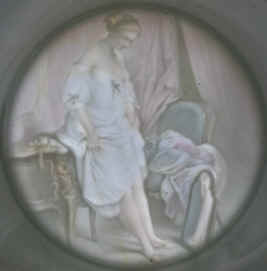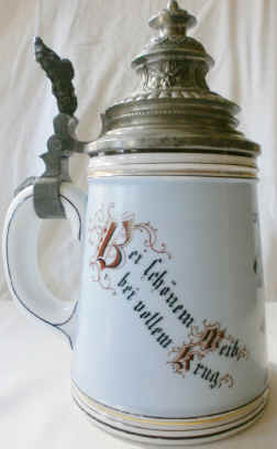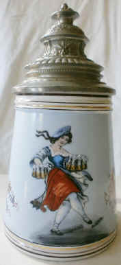 The word "Zug" has numerous meanings, but here it means a tug on one's heart strings for the beautiful woman and a long draught of beer for the full stein. The porcelain stein has a colored lithophane in the base, ca. 1900. The lithophane is a scene made by varying the thickness of the translucent porcelain viewable when held up to the light, which is colored in the same way that black and white photographs were tinted before colored photography. The scene on the front is of the Schützenliesl (Target Lady), a 19th century advertising motif from a famous painting of an actual beautiful lady. | |