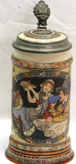 This etched Mettlach stein with mold number 2716 dated 1901 designed by Fritz Quidenus is often called the "Thanksgiving Stein", but I can't imagine why. | |