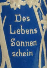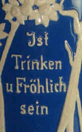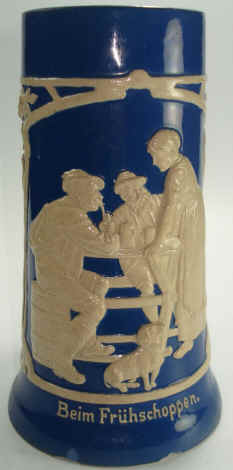 | Oh well, it's 5:00 O'clock somewhere. The Frühschoppen (early stein) is the precursor to the Dämmerungsschoppen (twilight stein - discussed under that name). These are gatherings of friends or family to have a social drink at appointed times. The stein (without lid) is marked "Musterschutz 346" (patented 346), ca. 1900. | |