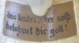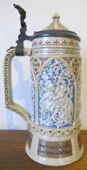 A variety of wisdoms appear on this applied relief stein marked with the Mettlach Mercury Mark and mold number 228 and dated 1901. | |
