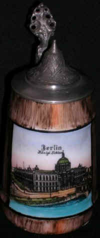 The scene is of the Royal Palace in Berlin on this unusual porcelain stein, ca. 1900.