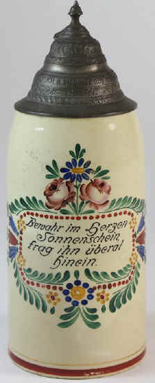 This verse has a philosophical ring to it meaning: Have a good attitude and question all your motives. The pottery stein appears to be hand painted, ca. 1900. | |