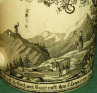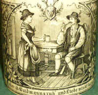 The Bayrisch (Bavarian dialect) captions under the three scenes are self explanatory on this PUG (printed under glaze) stein marked with the logo of Utzschneider of Saareguemine, ca. 1900. | |