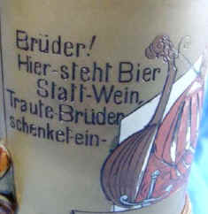 Brothers! Here stands beer instead of wine, dear brothers pour it out ( fill your steins). Long live every German man, who can swing (wave) a stein. |