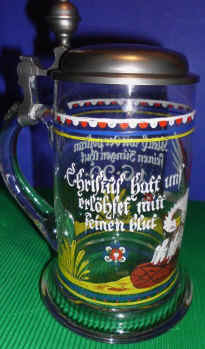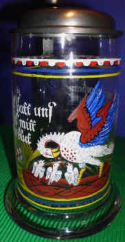 This modern glass stein is a reproduction of a stein originally dated 1699 and was made as a souvenir of a museum, ca. post WW II. The verse with archaic spelling and print is an analogy of the pelican nurturing its young with its beak as Christ according to the scriptures nurtured humanity with his blood. | |