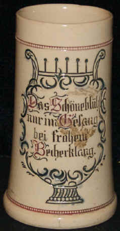 The verse seems to indicate that the clinking of steins helps with the singing of songs on this stein without lid, ca. 1900. | |