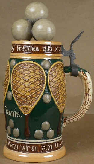 This is a relief character stein of "Lawn Tennis" with tennis racquets and balls by Matthias Girmscheid marked "1226 Germany 8" ca. 1900. | |
