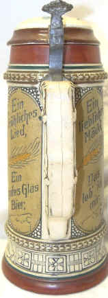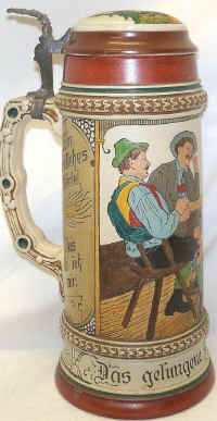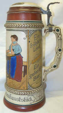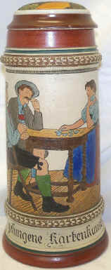 | This young maiden is showing a card trick and the gentlemen are eating it up which I expect they would be doing without the card trick. The etched stein is probably by Matthias Girmscheid and marked "Germany 4" and mold number "1259", ca. 1900. | |