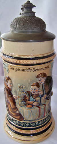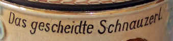 | The clever Schnauzer breed of dog is the theme on this stein made by Reinhold Hanke, marked only with a mold number "787", ca. 1900. The Schnauzer is thought to get its name from either the German words Schnauz (meaning "nose" for good sense of smell) or Schnauzbart (meaning "mustache" for the appearance of a mustache like growth of hair on its face). | |