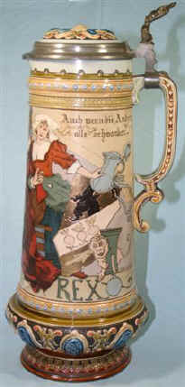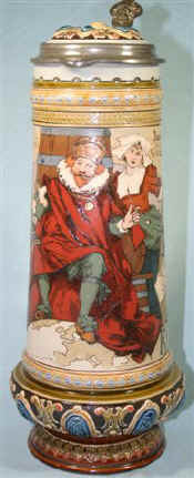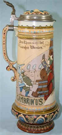 This is an etched Mettlach pouring stein mold number 2107 dated 1901 featuring a design by Heinrich Schlitt of Gambrinus Rex (King Gambrinus), the "King of Beer from Flanders" with his whimsical court which includes the animated steins and other beer symbols all paying homage to the king. | |