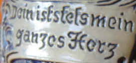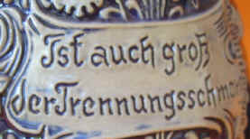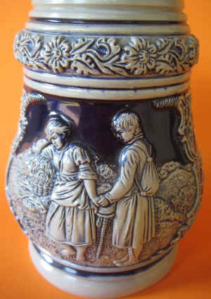 | Parting is such sweet sorrow seems to be the theme on this relief stein without lid marked "Western Germany - Original Thewalt 1297", ca. post WW II. | |