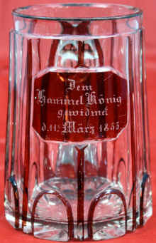 This glass stein without lid was given probably as a joke to a friend who was nicknamed "Mutton King". I suspect the name is something like "Mutton Head" in English and might refer to someone in a game. The glass stein without lid with a ruby-flashed and cut-to-clear decor is dated 1855 and is one case where the date actually indicates the year when the decoration was applied to a blank that might have been made earlier and pulled off the shelf for decorating. | |