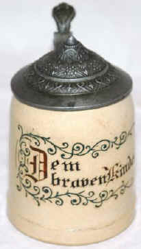 I could have used one of these when I was a little kid, but I guess it wasn't our custom. This child's stein is marked with the logo of Merkelbach & Wick of Hohrgrenzhausen and "Z", ca. 1900. | |