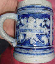 Let the good have the best and the bad have the rest is the message on this blue/gray, salt-glazed stein without lid, ca. 1900. | |