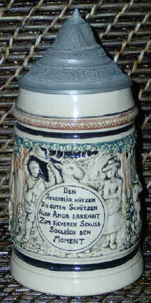| We've probably all experienced the subject of the verse on this relief stein marked only "66" or "99" probably by Dummler & Breiden ca. 1900. | |