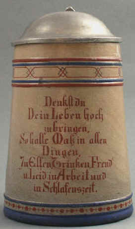 A good philosophy for the round-the-clock drinker on this stein probably designed by A. Sältzer, ca. 1900. | |