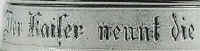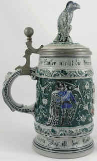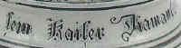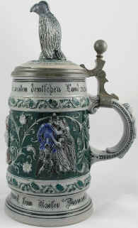 | This is a literal translation of the verse which seems to indicate that the hearts of all the Germans in the land are to the Kaiser like the diamond in his crown. The relief, salt-glazed, stoneware stein features the likeness of Kaiser Wilhelm I and is marked with the Reinhold-Merkelbach logo and "324", ca. late 1800's. It's interesting to note that at the time of the unification of Germany (1871), the German title of König (king) transitioned to Kaiser (emperor) which is derived from the Latin Caesar and a cognate of the Russian Czar, Tzar, Tsar. | |