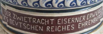 Otto von Bismarck was the greatest force in the unification of Germany in 1871 and was the favorite power behind the throne of Kaiser Wilhelm I. He controlled Germany as the "Eiserner Kanzler" (Iron Chancellor) from 1871 and led with strict Prussian discipline, but fell out of favor with Kaiser Wilhelm II and was dismissed by him in 1890. This verse reflects his actions that relieved the stress among the smaller German states and between the ideologies among the people that were tending toward socialism and the elite that wanted strict control. The relief stein with the bust of the beloved Bismarck was, made by Reinhold Hanke, but marked only "1275 Germany", ca. 1900. | |