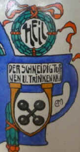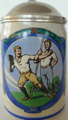 | I guess the Germans could do it all from this verse on a Jugendstil (youth style = modern art) stein designed by Carl Moos, ca. early 1900's. This is a Turnverein (Gymnastics Association) or 4Fstein. Their motto "Gut Heil" (Good Health) and their symbol of back to back "F"s can be seen on the side panels. For more information, see translations "Gut Heil" and "Deutsches Turnfest". | |