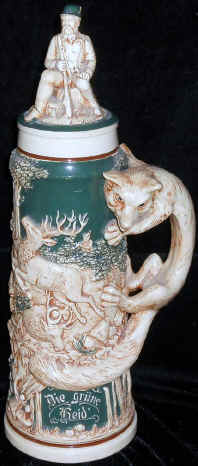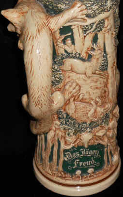 The verse is self explanatory on this large, relief stein by Matthias Girmscheid (mold# 1032) with set on lid and fox figural handle, ca. early 1900's. | |