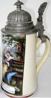 This is a very sentimental verse on a porcelain stein with lithophane (scene in base viewable when held up to the light), ca. 1900. | |