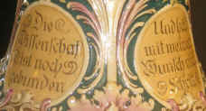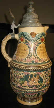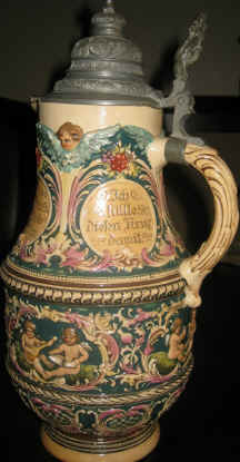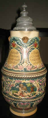 | The author of this verse is not waiting for science to find the elixir of life, he's just going to fill this stein with beer that he knows already works like the elixir of life. The 2-liter, pouring stein is marked only "148 7", ca. 1900. | |