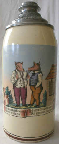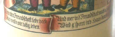| This is a literal translation that is awkward in English but rhymes in German and accompanies a scene that shows two gentlemen pigs that seem to be pledging a long friendship and happy life, but if one breaks the bond, then he gets confined to the house next door which looks like a jail with barred window and door. The stein is marked "D&C" for Dorfner & Co. of Hirschau, ca. late 1800's. For more info see: Chris Wheeler's "Stein Marks". | |
