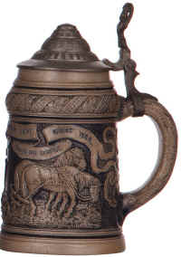 | This blue/gray, salt-glazed, stoneware stein has an obvious anti-Semitic theme and verse and shows that there was some degree of anti-Semitism in Germany decades before the Holocaust, ca. 1900. | |