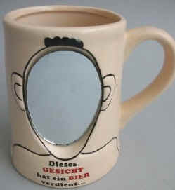 | This is a novelty stein without lid that has a mirror so it's your face when you look at it that deserves a beer. The reverse side has "Feierabendseidel" which translates to "evening leisure stein" or "after work stein", ca. 2000. | |