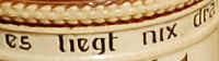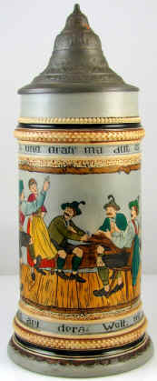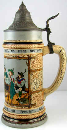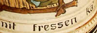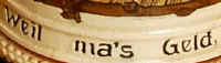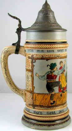 | You might as well have fun in this world because, what else can you do with the money, seems to be the theme on this etched stein marked "3013 12 Germany", ca. 1900. The verse is written in Bayrisch (Bavarian dialect). | |