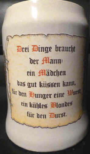 | The verse is self explanatory on this stein without lid marked W. Germany, after WWII. | |