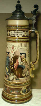 Two good beer sayings on this 3.3 L. PUG (printed under glaze) Mettlach mold number 2180, decor number 955 designed by Heinrich Schlitt made in 1896 as marked. | |