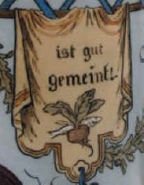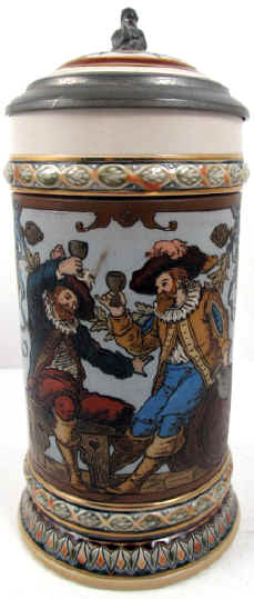 A nice sentiment on this etched Mettlach stein designed by "C. Warth" and marked with the Mettlach logo and mold number "1932" and dated 1895. | |