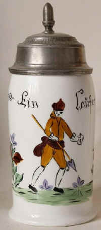 The messenger appears to be delivering a love letter on this Milchglas (milk glass) stein of the so-called Biedermeier (Early Victorian or Empire) period, ca. early 1800's. | |