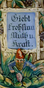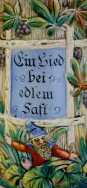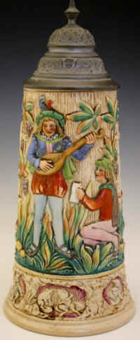 | Sounds good to me on this relief stein in the manner of Adolph Diesinger marked "Gesetzlich Geschützt 1756 15" (legally protected = patented), ca. 1900. | |