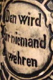 The keywords here are "honor" and "should not", but beware of someone "bird-dogging" your girl friend. The relief stein (without lid) is marked with the Thewalt logo and "Alt Grenzau 1894 Western Germany" ca. post WWII. | |